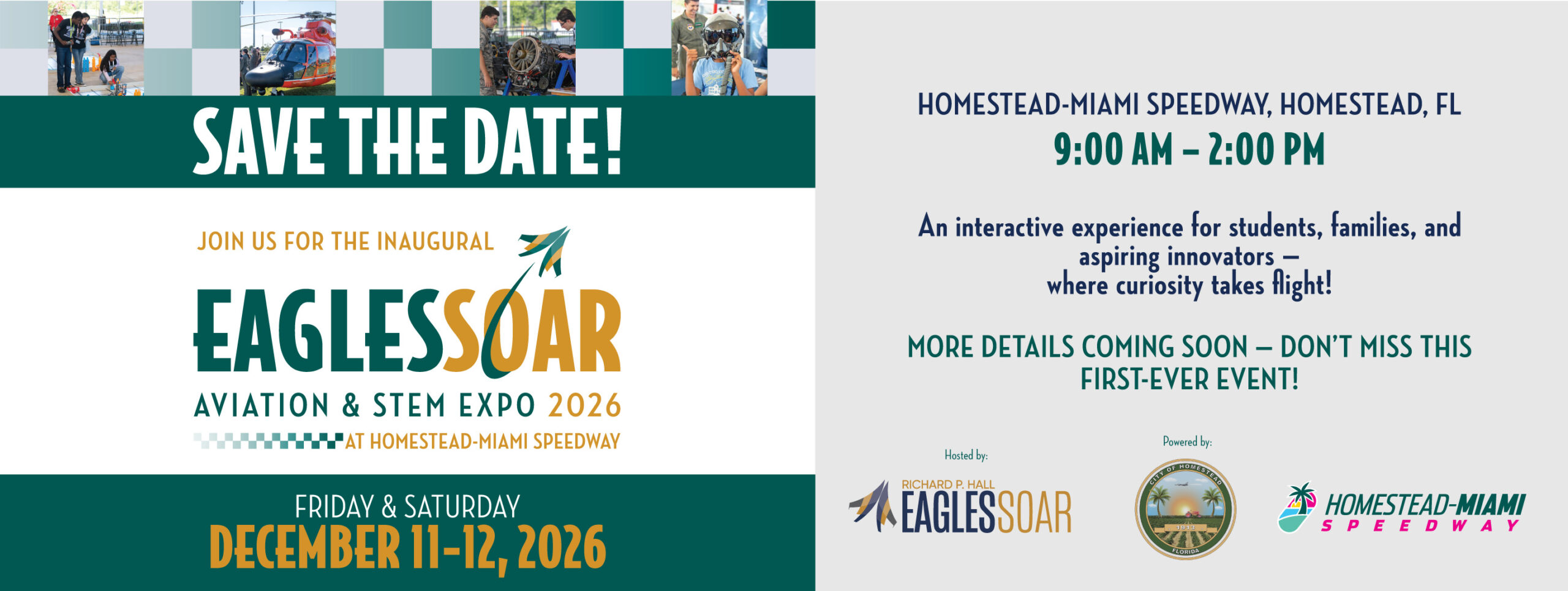 The EAGLES SOAR Aviation & STEM Expo connects grades 6–12 students, families, educators, and industry leaders in a high-impact, FREE two-day immersive experience, hosted by the Richard P. Hall Eagles Foundation, Inc., a Florida nonprofit corporation and registered 501(c)(3) charitable organization and powered by the City of Homestead, December 11 & 12, 2026, 9:00 AM – 2:00 PM, at the Homestead-Miami Speedway, One Ralph Sanchez Speedway Boulevard, Homestead, FL 33025.